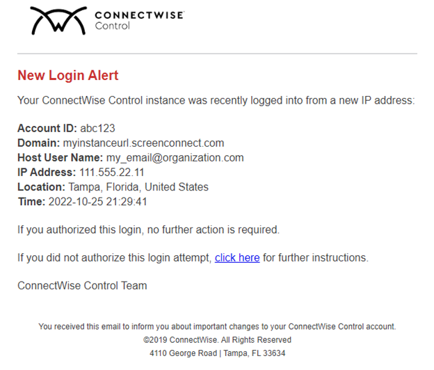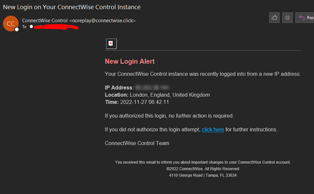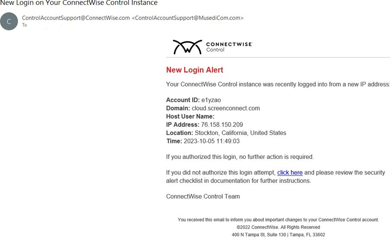 We are aware of a phishing campaign that mimics ConnectWise Control New Login Alert emails and has the potential to lead to unauthorized access to legitimate Control instances. Email phishing attacks continue to grow in sophistication, often mirroring legitimate email and web content.