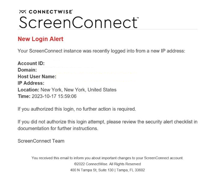Please note, ScreenConnect does send legitimate new login alerts via email as shown in this screenshot. ConnectWise alerts do not have a “click here” link for any login notifications. If you see a link in your notification, it is not legitimate. It is also important to note that the Account ID will never match your actual account ID. Either of these two indicators is a clear giveaway to the phishing campaign.